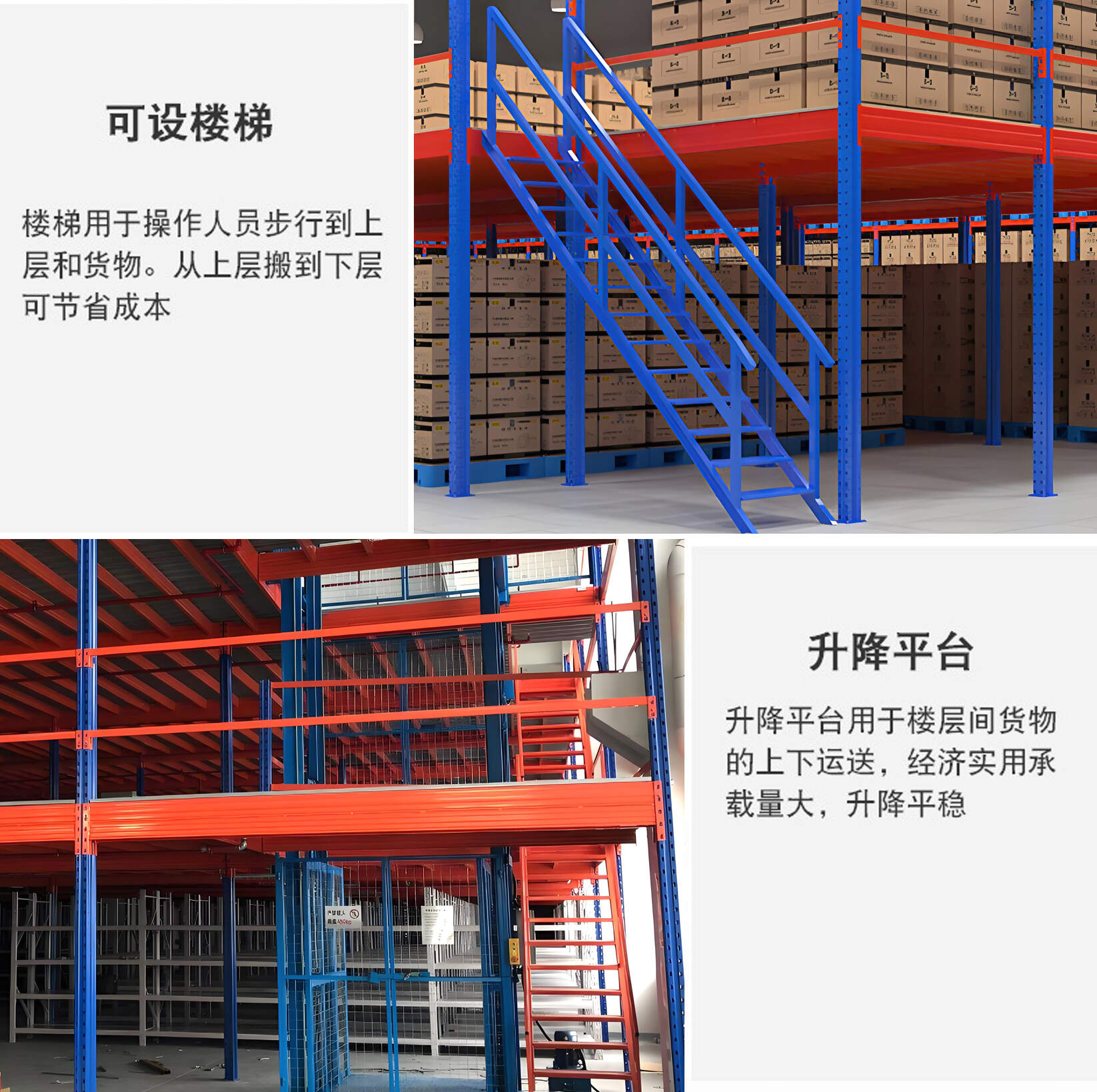 Stairs can be set up: Stairs are used for operators to walk to the upper level and goods, and moving from the upper level to the lower level can save costs